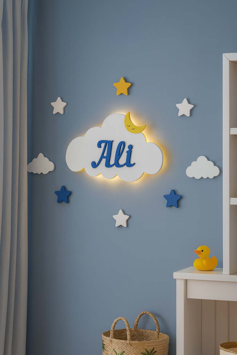 İsimli Bulut Gece Lambası Bebek Çocuk Odası Duvar Dekorasyonu Aydınlatma Ahşap Dekorasyon