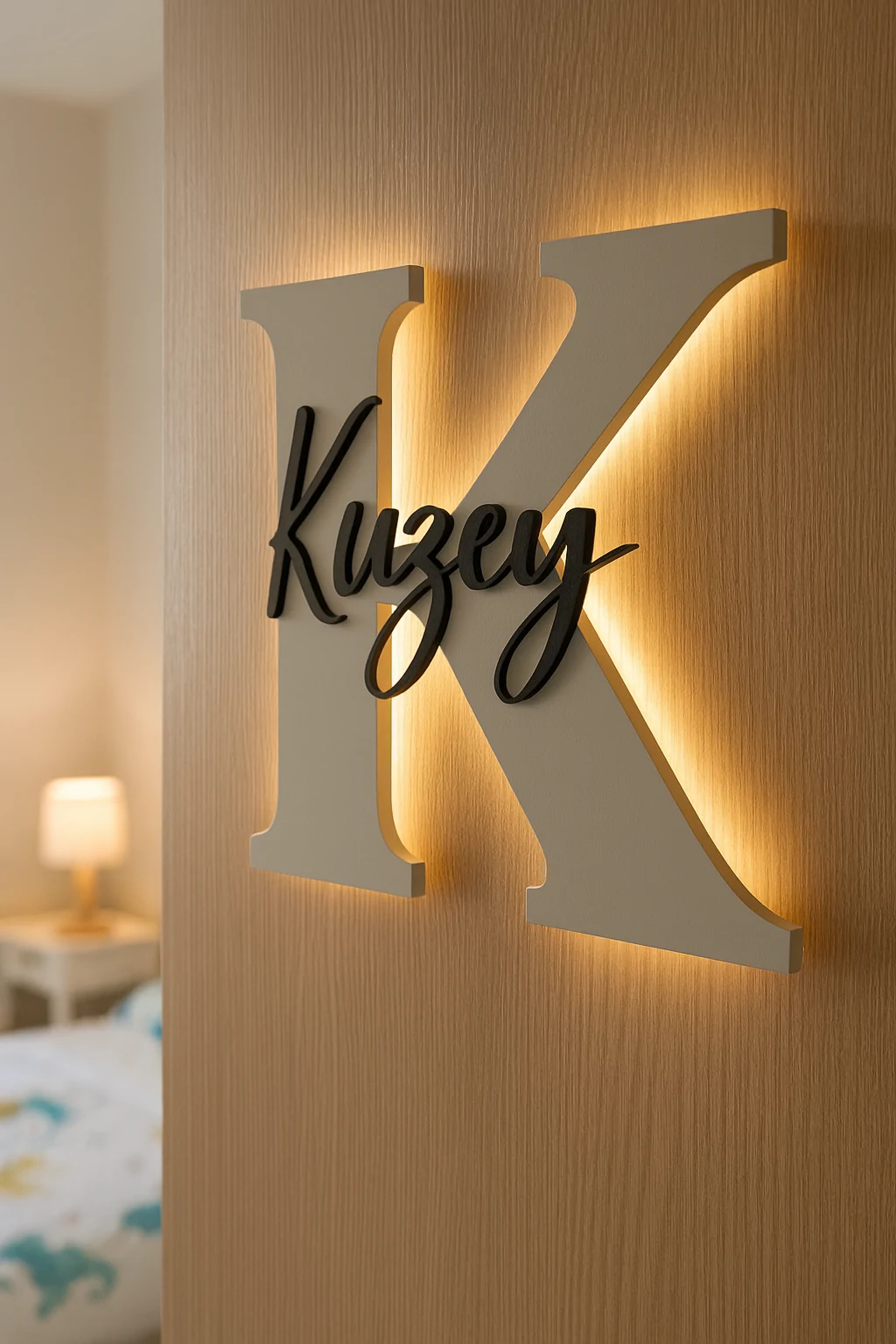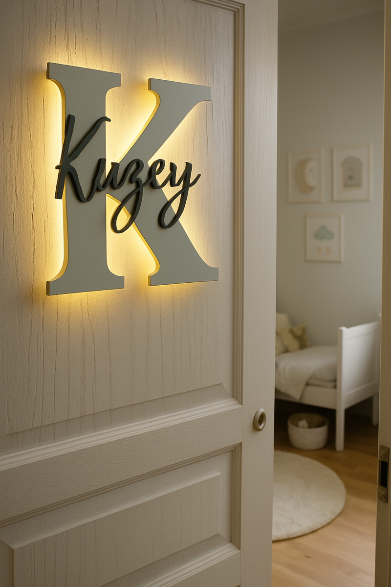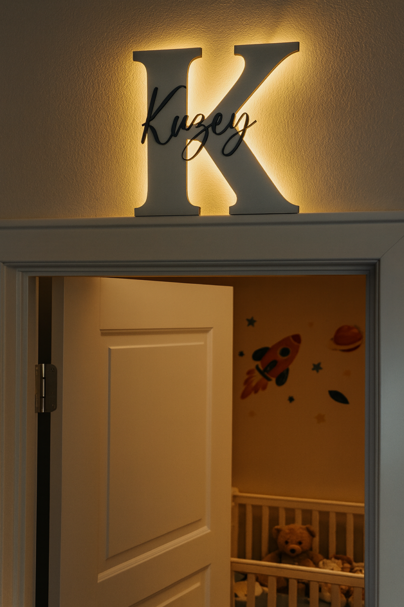 Bebeğinizin veya çocuğunuzun odasına sıcak ve kişisel bir dokunuş katmak için özel olarak tasarlanan ışıklı ahşap harf kapı süsü, isimlere özel olarak üretilmektedir.