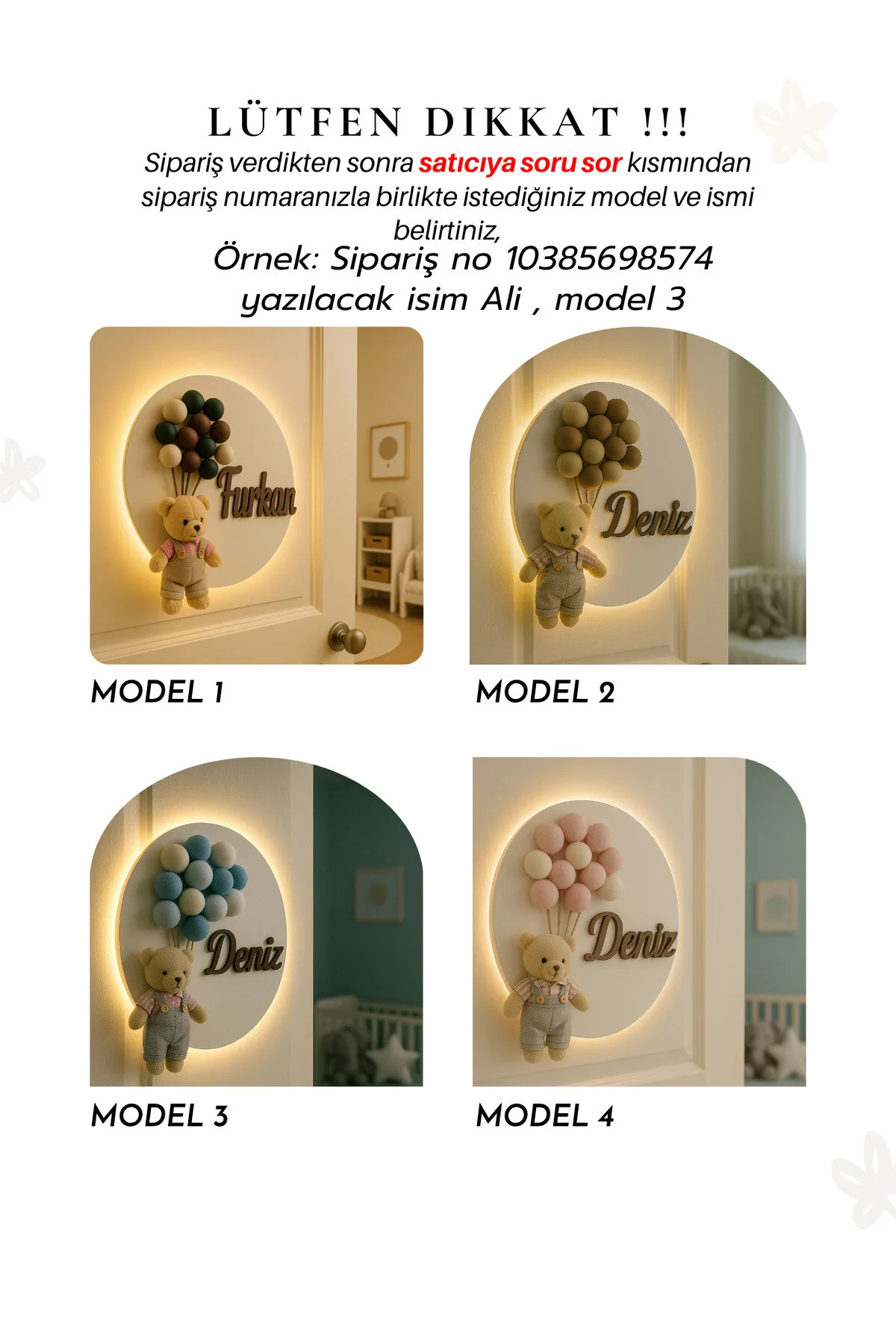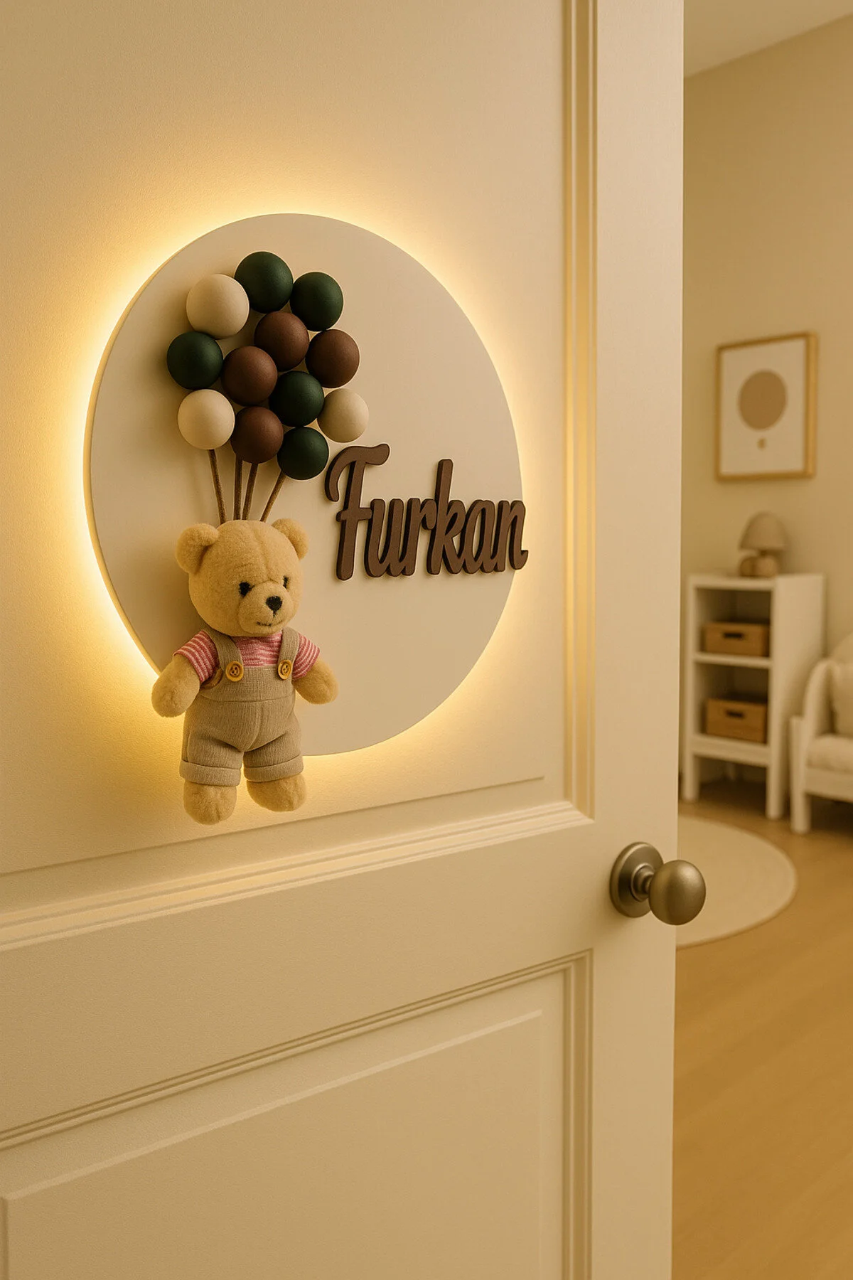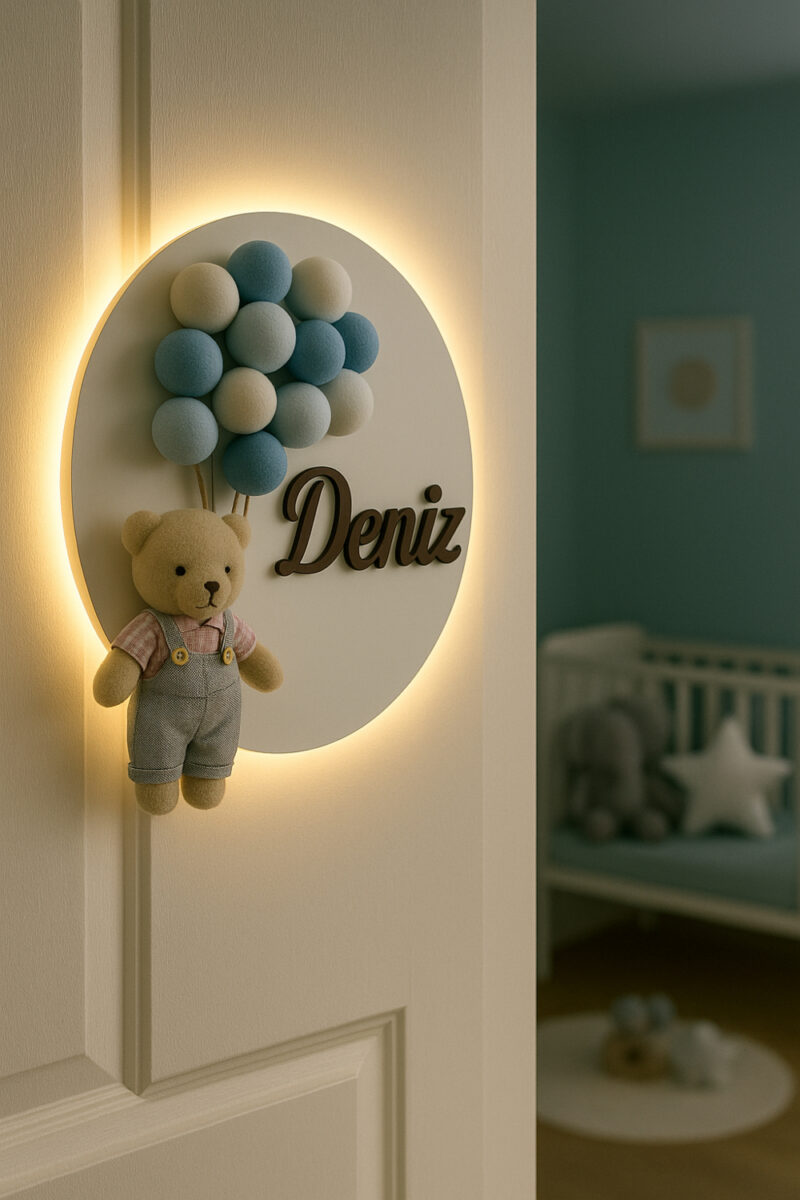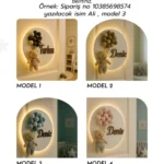 İsme özel 30 cm ışıklı ahşap harf kapı süsü, bebek ve çocuk odaları için kişiye özel dekoratif isimlik.